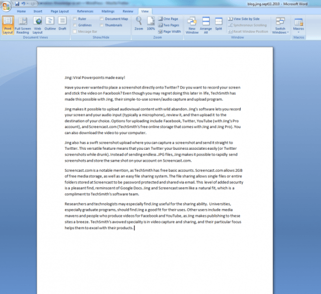 Have you ever wanted to place a screenshot directly onto Twitter? Do you want to record your screen and stick the video on Facebook? Even though you may regret doing this later in life, TechSmith has made this possible with Jing, their simple-to-use screen/audio capture and upload program.